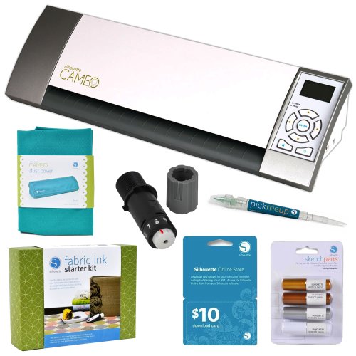 Silhouette Cameo Electronic Cutting Tool + Dust Cover Teal + Fabric Ink Starter Kit + $10 Download Card + Accessory KitSilhouette Cameo Electronic Cutting Tool + Dust Cover Teal + Fabric Ink Starter Kit + $10 Download Card + Accessory Kit Detail : The Silhouette CAMEO is an electronic cutting tool for personal use. Like a home printer, it plugs into your PC or Mac with a simple USB cable. However, instead of printing it uses a small blade to cut paper, cardstock, vinyl, fabric and more up to 12" wide and 10 feet long. The machine also boasts a quiet motor and the ability to register and cut printed materials.